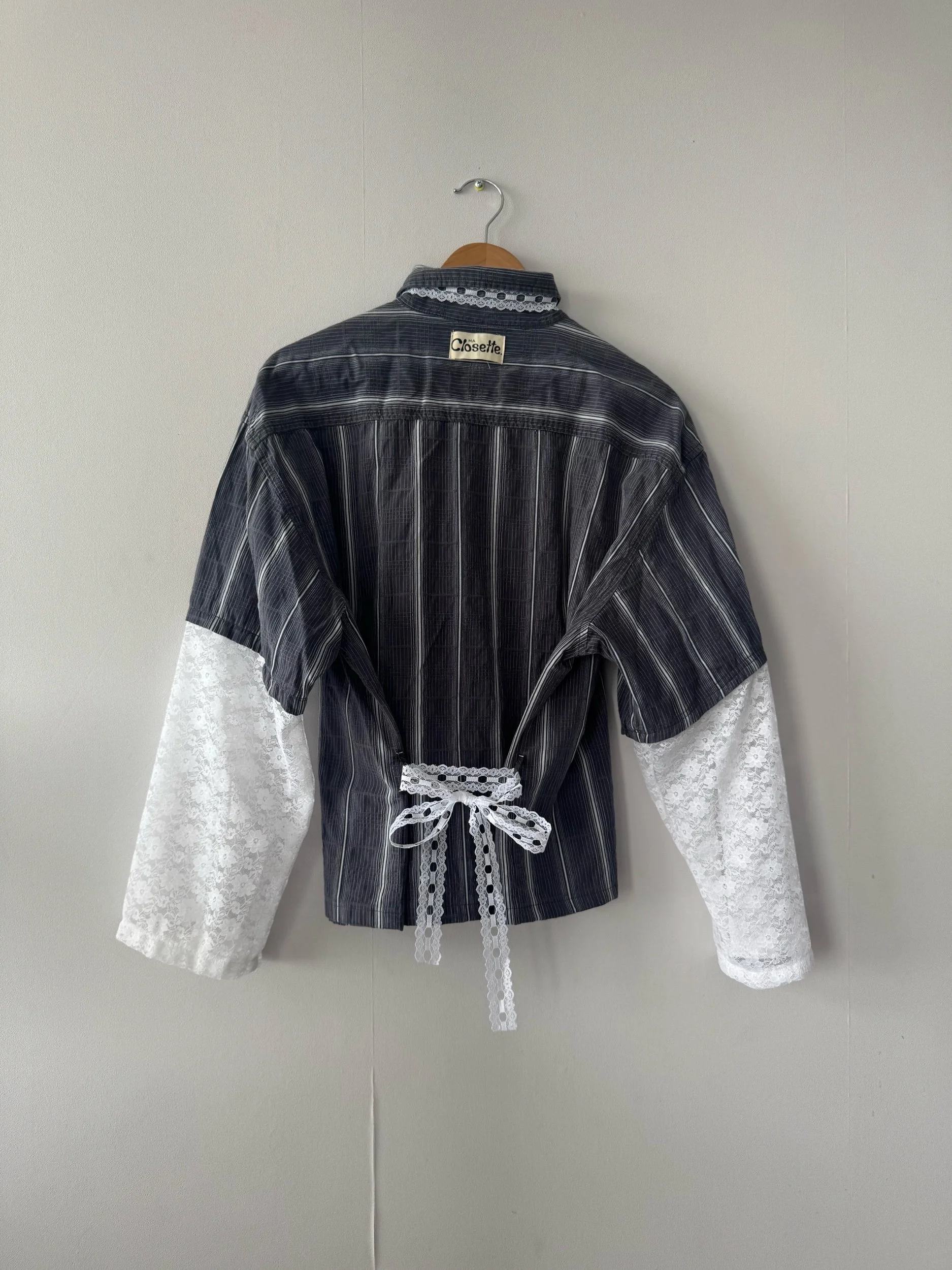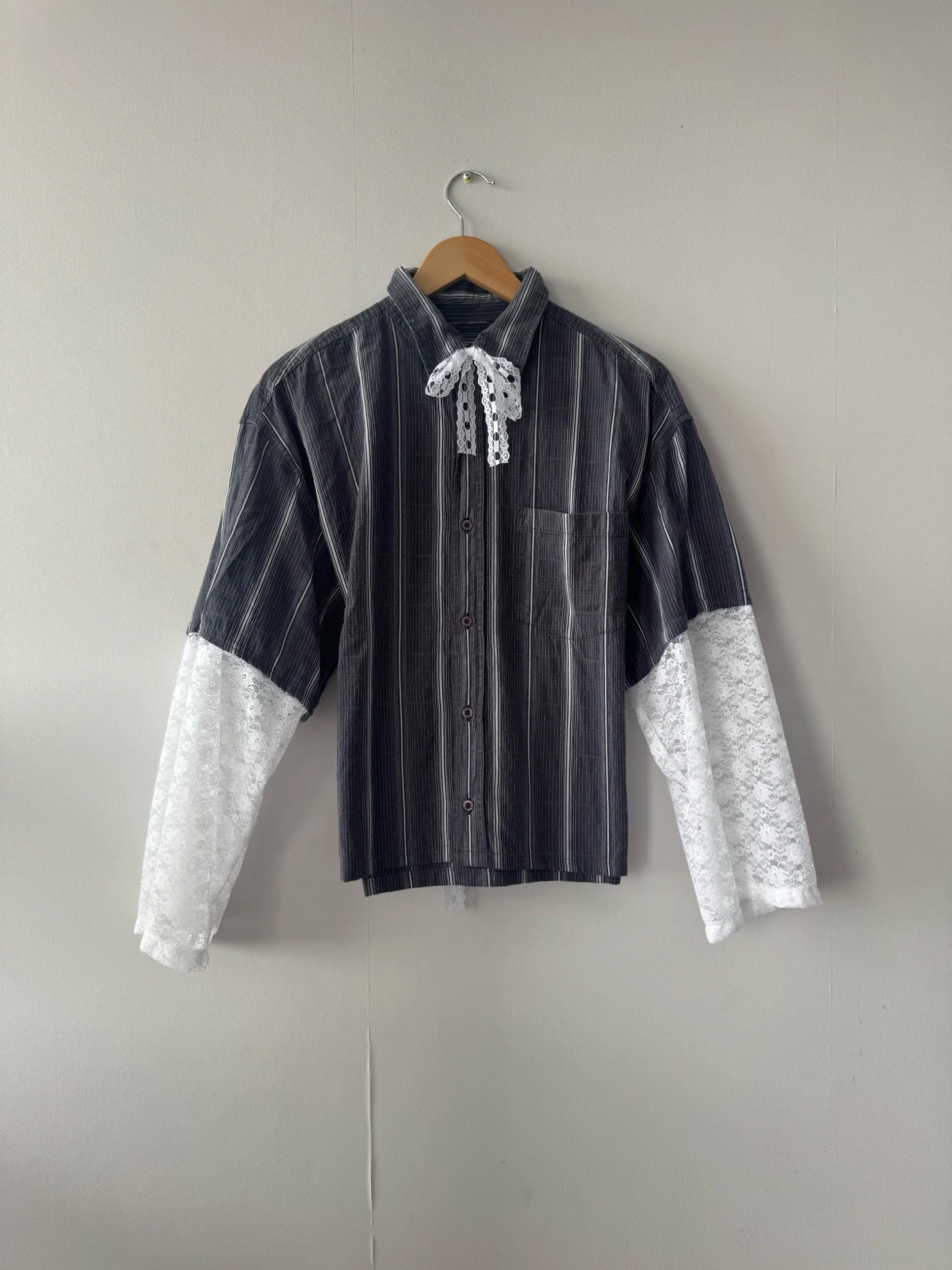 La chemise upcyclée « Yanou » une pièce unique, née du réemploi d’une chemise en coton chinée et transformée à la main dans notre atelier angevin.